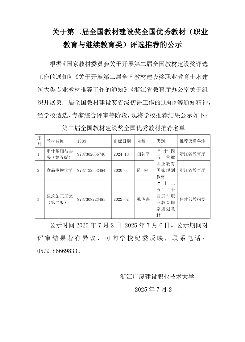 关于第二届全国教材建设奖全国优秀教材(职业教育与继续教育类)评选推荐的公示