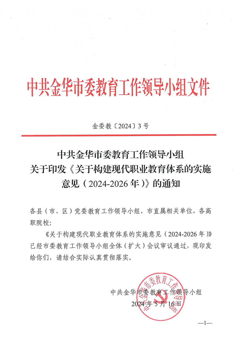 关于转发《中共金华市委教育工作领导小组 关于印发<关于构建现代职业教育体系的实施意见(2024-2026年)>的通知》的通知 来源: 作者: 发布时间:2022-05-30 浏览次数: 次 【字体:小 大】 各学院、各部门: 《关于构建现代职业教育体系的实施意见(2024-2026年)》已经市委教育工作领导小组全体(扩大)会议通过,现在转发给你们,请结合实际认真贯彻执行。科研与社会合作处2024年5月30日 【打印正文】