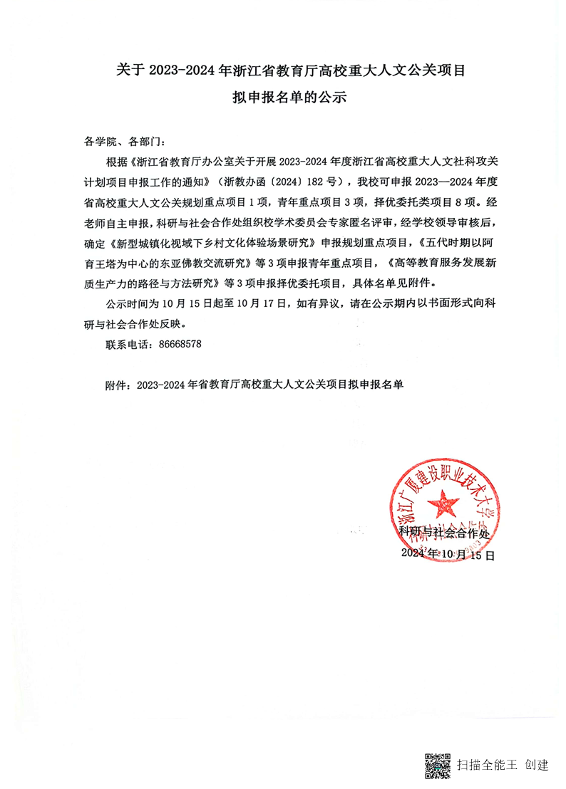 关于2023-2024年浙江省教育厅高校重大人文公关项目拟申报名单的公示
