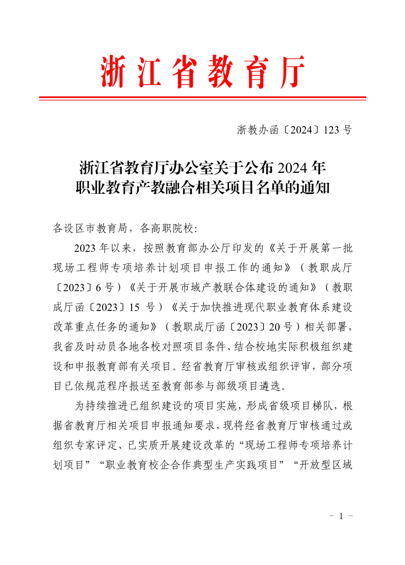 浙江省教育厅办公室关于公布 2024 年 职业教育产教融合相关项目名单的通知